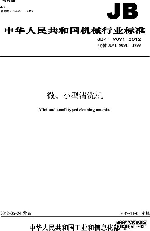 熊貓通用機(jī)械集團(tuán)有限公司和合肥通用機(jī)械研究所(即中國通用機(jī)械研究院)起草了《微、小型清洗機(jī)》的行業(yè)標(biāo)準(zhǔn),并在2012年11月1日正式開始實(shí)施。該 標(biāo)準(zhǔn)涉及了最大壓力40MPa,最大90L/min的大部分常見的高壓清洗機(jī),也可以說就是高壓清洗機(jī)的行業(yè)標(biāo)準(zhǔn)。